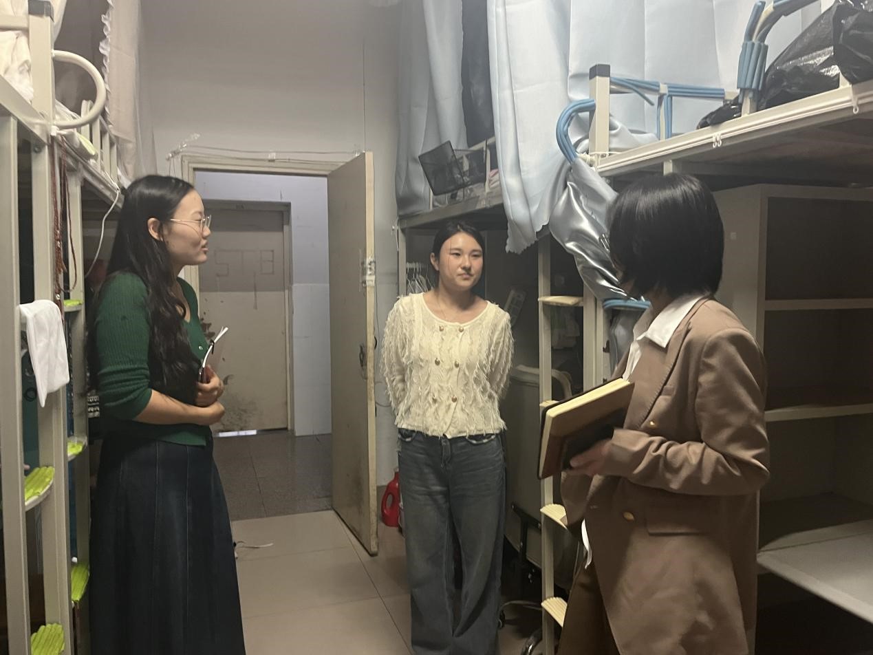 最后,潘晓芳、崔向超和孙焕宇还分别走访了研究生宿舍,老师们在了解大家的生活情况和假期计划后,仔细排查了宿舍的安全隐患,并提醒同学们注意用电安全、防火防盗,强调务必保证人走电关,有雨时务必关窗,以避免阳台插座漏电现象。学院领导和老师们与同学们亲切交谈,鼓励大家在遇到困难时及时向学院反映。同学们对学院的关心表示衷心感谢,并保证会严格遵守学校的规章制度,确保宿舍安全。