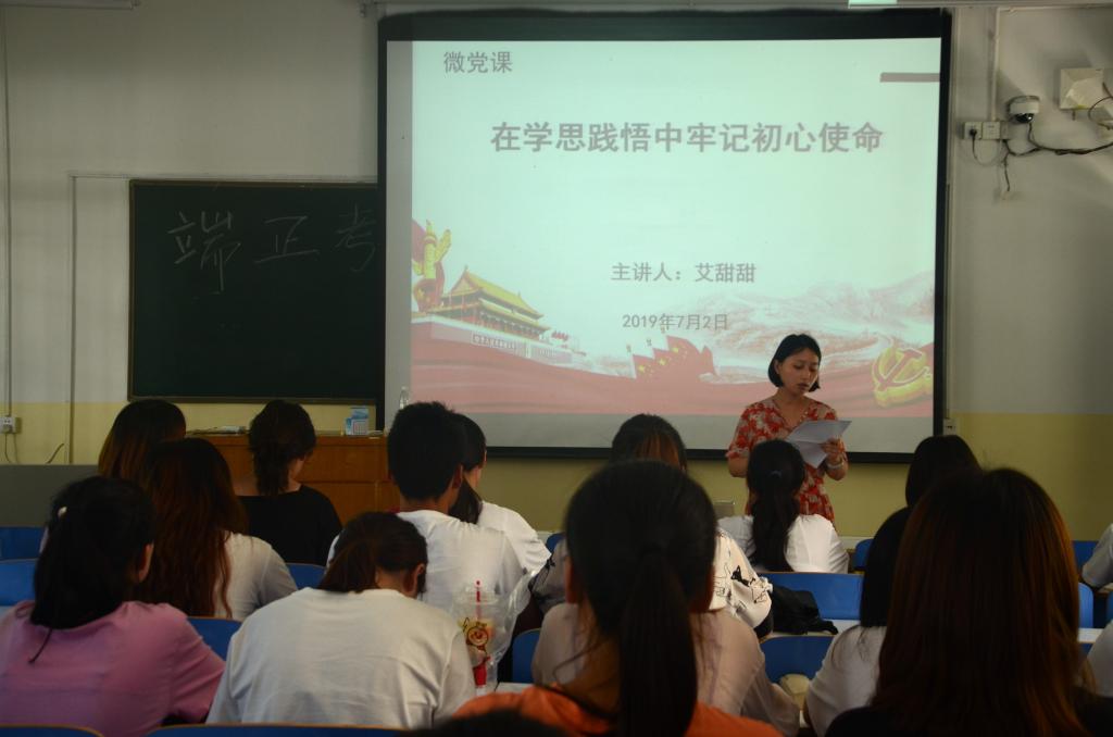 7月2日,威尼斯9499登录入口学生第一党支部书记艾甜甜同志于教三03为支部党员讲党课,主题为“在学思践悟中牢记初心使命”。学生第一党支部全体党员、入党积极分子三十余人参加了此次党课学习。