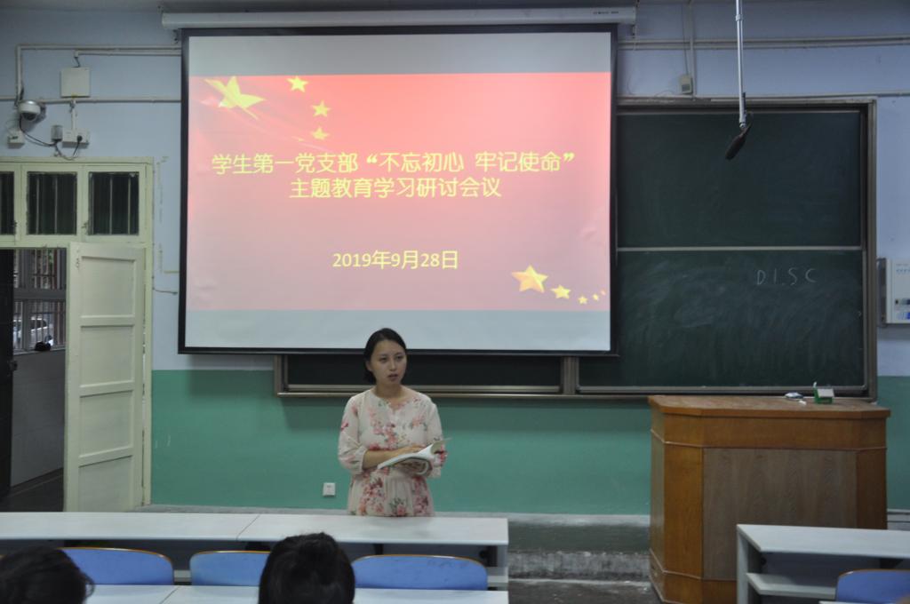 9月28日,威尼斯9499登录入口学生第一党支部于教二梯二举行“不忘初心 牢记使命”主题教育学习研讨会议。学生第一党支部书记艾甜甜与支部全体党员共同参加此次会议。会议由艾甜甜主持。