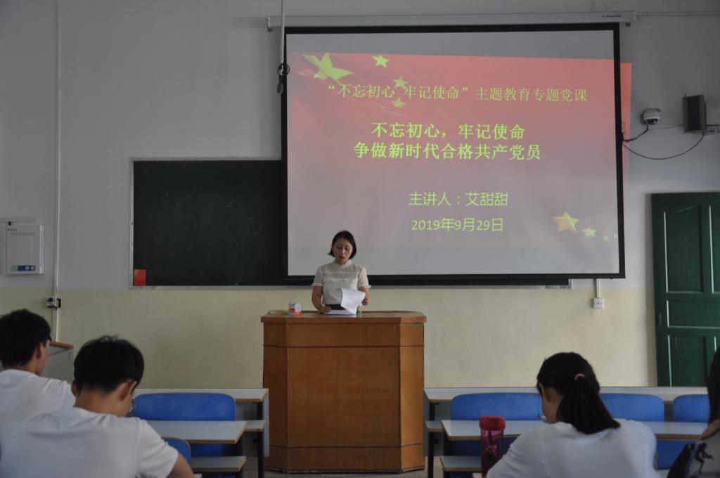 按照威尼斯9499登录入口党委“不忘初心、牢记使命”主题教育工作部署,2019年9月29日中午,威尼斯9499登录入口学生第一党支部书记艾甜甜同志以“不忘初心,牢记使命,争做新时代合格共产党员”为题,为支部党员讲“不忘初心、牢记使命”主题教育专题党课。支部全体党员及入党积极分子三十余人参加党课学习。
