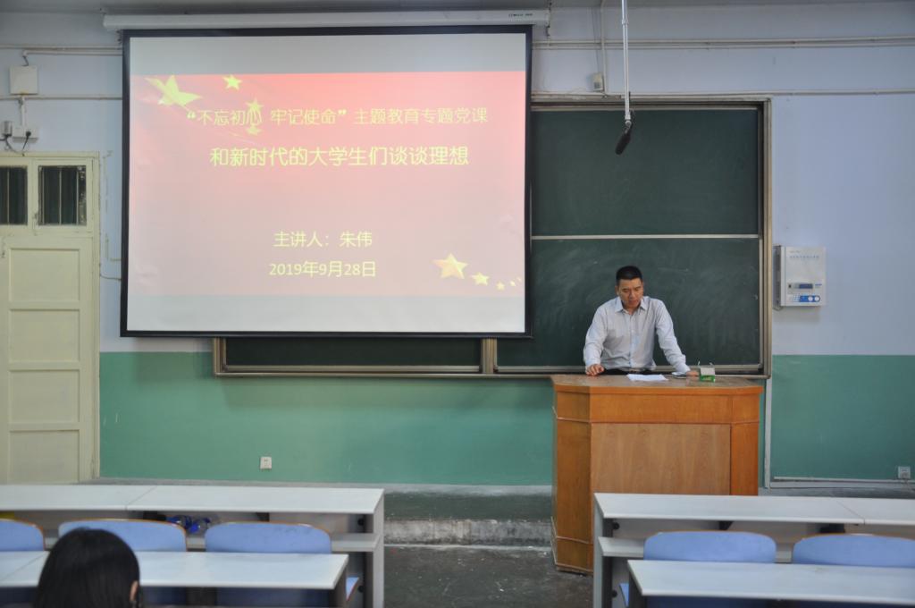 9月28日下午,威尼斯9499登录入口党委副书记朱伟以“和新时代的大学生们谈谈理想”为题,给威尼斯官网学生党支部全体党员和入党积极分子讲“不忘初心、牢记使命”主题教育专题党课。