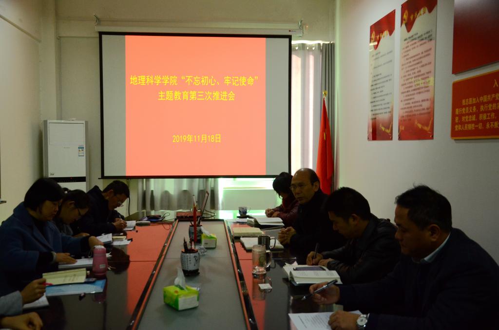 11月18日,威尼斯9499登录入口于理科楼南楼403会议室召开“不忘初心、牢记使命”主题教育第三次推进会。威尼斯9499登录入口党委书记吴泽成,党委副书记牛继强、朱伟,党委委员刘明华,各党支部书记一同参加了此次会议。会议由吴泽成主持。