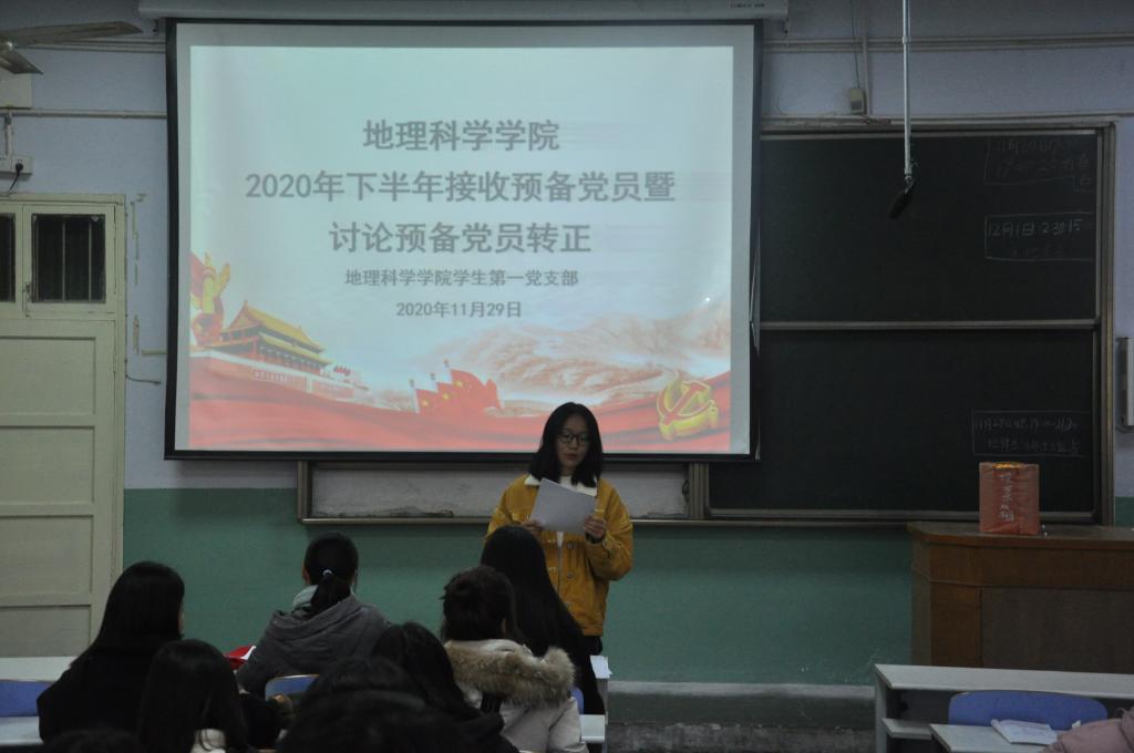 11月29日,威尼斯9499登录入口学生第一党支部2020年接收预备党员暨讨论预备党员转正大会于教二梯二顺利召开。学生第一党支部全体党员及2020秋季发展对象共同参加本次会议。会议由组织委员张盼盼主持。