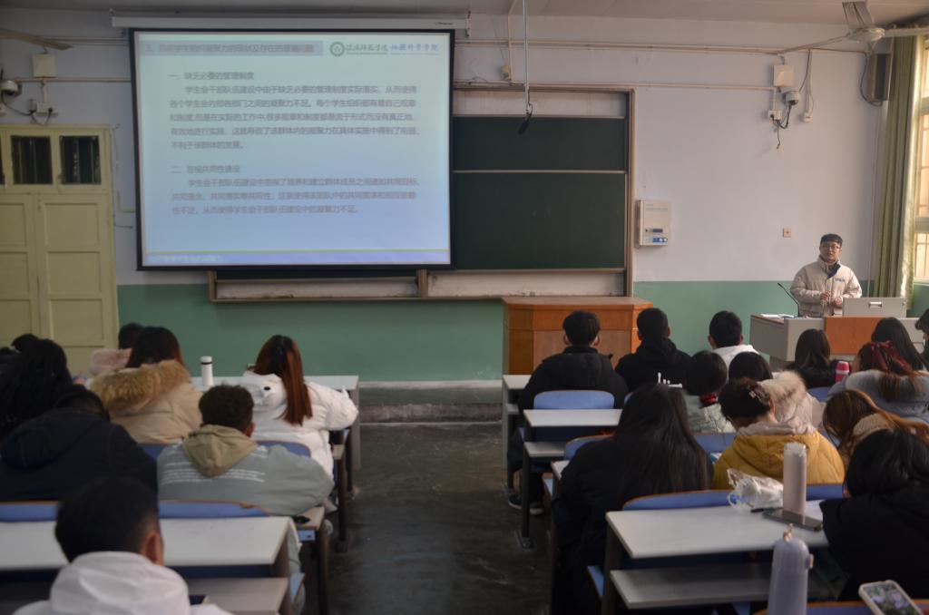 会议伊始,朱浩东以PPT形式向全体成员提出六个问题,并依次进行详细解答。他以“什么是凝聚力”展开课堂,用生动形象的语言为学生干部介绍“凝聚力”的具体内涵,并结合学生干部的工作,强调了凝聚力的重要性。接着,他对学生组织凝聚力的现状及目前存在的普遍问题进行总结,结合自身经历,提出详细的解决办法。同时,他指出高凝聚力的学生会的意义,学生干部目标明确统一、具备高度的参与感、拥有共同的荣辱感,才能更好地完成学生会工作。最后,朱浩东希望大家保持相互信任、乐于奉献、勇于担当、持之以恒的心态,形成一种以责任为基础的凝聚力,做一名优秀的学生干部。