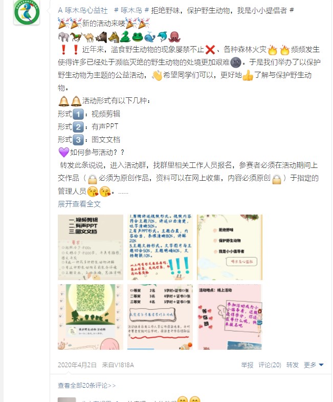 2020年4月2日信阳师范学院威尼斯9499登录入口举办了“拒绝野味,保护野生动物”的科普活动,本次活动通过鼓励同学们自己查询相关知识,制作科普视频,分享自己喜欢的生物,让更多的人了解并接触相关的知识,了解生物的多样性,更多的丰富自己的知识,了解各种生物的习性。