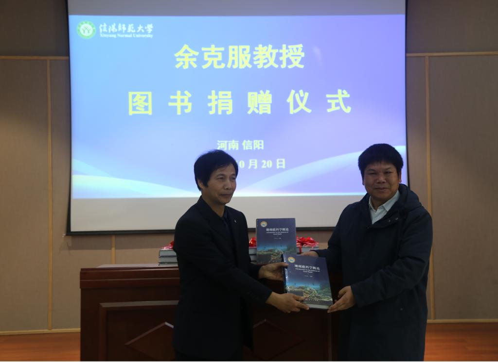 报告开始前举行了图书捐赠仪式,余克服教授向图书馆捐赠了50本其撰写的学术专著《珊瑚礁科学概论》。图书馆馆长贾义保代表受赠单位致辞,并为余克服教授颁发捐赠证书。贾馆长对余教授的到来和图书捐赠表示感谢。余教授期望更多人能了解珊瑚礁研究的现状,并希望专业相关的师生在该领域进行更深入的研究。