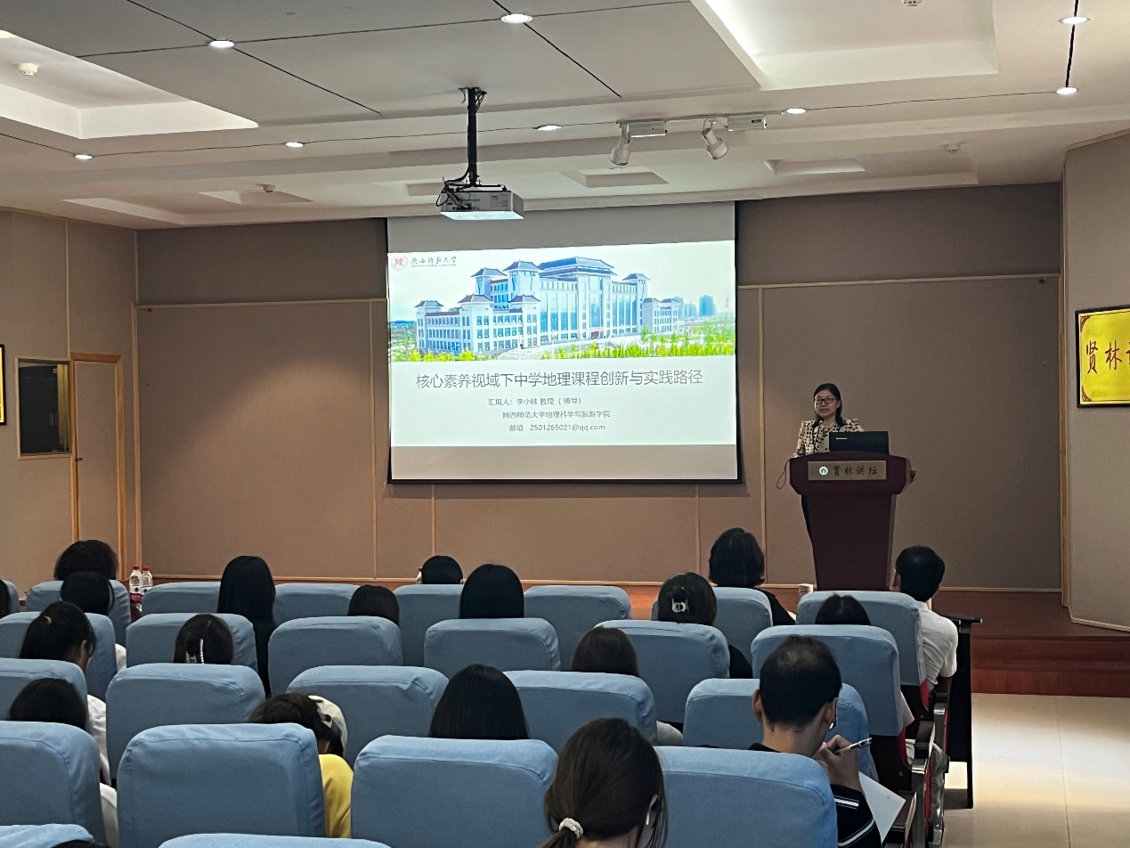 报告会上,李小妹教授从地理学的概念引入,结合多部地理学经典论著,探讨了地理学思想方法在统摄中学地理教学内容的重要性,提出地理核心概念中的六大地理问题。随后,李教授以地理核心素养中的区域认知为例,结合高考真题,详细解读了地理核心素养的定义与溯源,并详细解读了地理跨学科主题学习的内涵及实施路径。报告结束,李教授和与会师生进行了精彩互动,现场气氛热烈。副院长王义民对李小妹教授带来的精彩报告表示感谢。王院长指出,李教授的报告理论性强,高屋建瓴、深入浅出。报告突出了应用性,为地理教学提供了可操作的路径和实用方法,在场师生均受益匪浅。