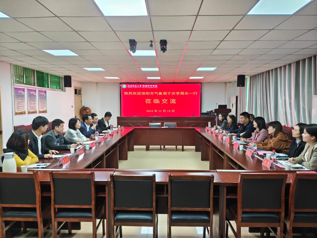 为推进信阳师范大学和信阳市气象局的深度战略合作,2024年11月15日上午,信阳市气象局党组书记、局长于庆学,副局长胡玉梅、赵辉,信阳市气象学会秘书长王梦旖、业务科副科长邱列君、杨慧洁以及科技服务中心主任曹雨和副主任杨雪一行8人莅临威尼斯官网座谈交流。威尼斯9499登录入口副院长颜俊、闫军辉、潘晓芳,科研与研究生工作秘书崔向超、教学秘书刘晓咏、地理信息科学系主任张兴国以及颜伟博士和刘昱君博士参与此次座谈,座谈会由闫军辉主持。