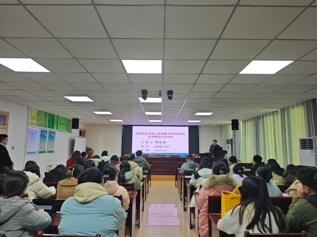 报告会上,樊良新教授首先回溯了近八十年来我国农村饮水安全工程保障的历程,并指出当前农村饮水安全面临的问题。随后,樊教授通过对比农村与城市供水系统的差异,指出我国农村用水供需矛盾下间歇式供水方式的适配性;接着,樊教授对居民用水感知与行为进行关联分析,深入探讨居民的节水意识与行为。针对这些问题,樊教授提出了开展农村地区室内节水活动、提高居民用水信息透明度、重视女性在家庭用水与节水中的主体地位等的对策和建议。最后,樊教授从行为学视角出发,分享了自己在用水行为及节水干预方向的研究动态。樊教授的报告深入浅出、条理清晰,与会师生均受益匪浅。颜俊作总结发言,对樊教授的精彩报告表示高度赞扬和诚挚感谢,并鼓励大家会后与樊教授进一步深入沟通交流。